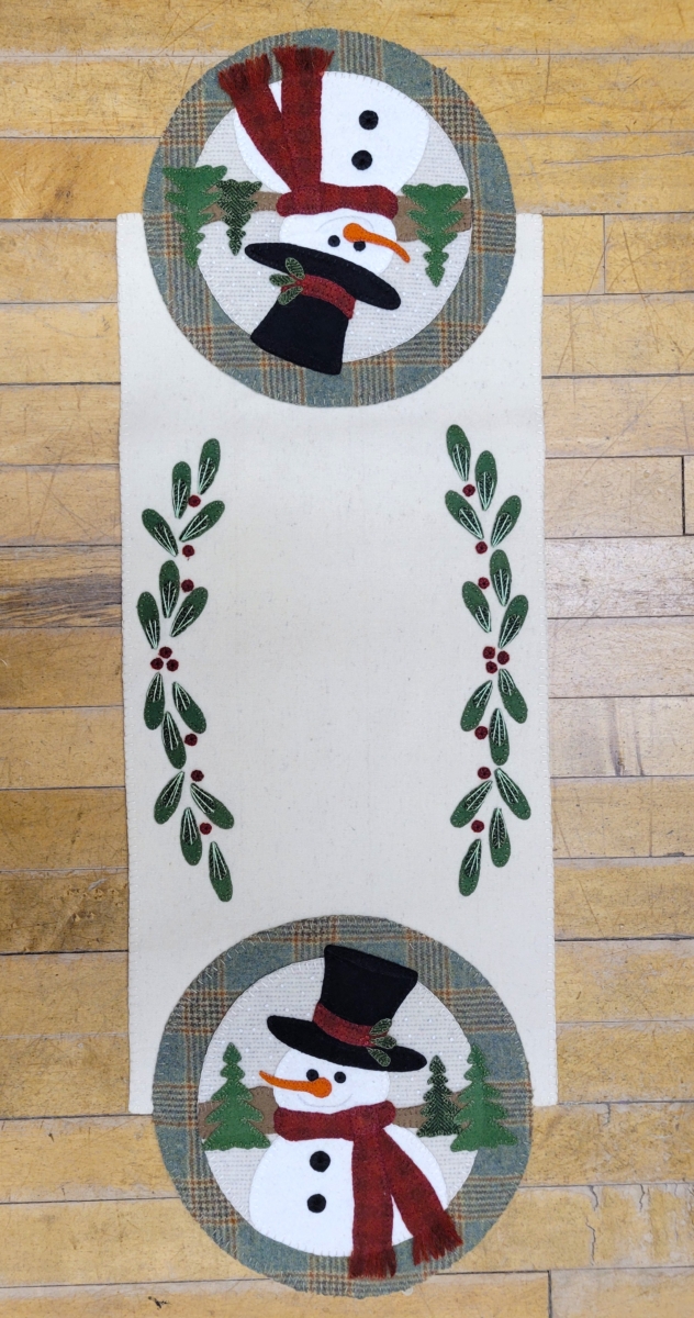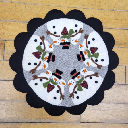 A flurry of friendly snowmen circle this wool mat. 13″ x 13″ .