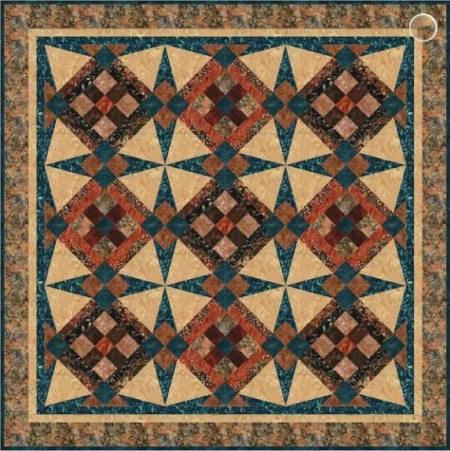 Beautiful blue and brown batiks are showcased in this quilt that uses easy paper piecing for the angled blocks. 55″ x 55″