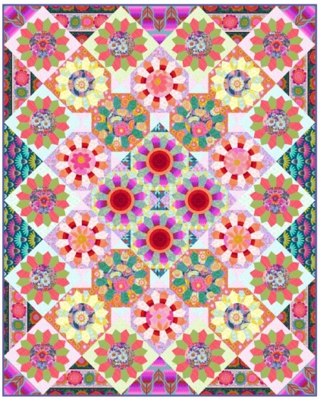 Not your grandma’s dresden plate! Gorgeous fabrics from Anna Maria Textiles make this a bold and vibrant design. Boxed kit contains the pattern, fabric for the top and binding and templates. 68″ x 85″