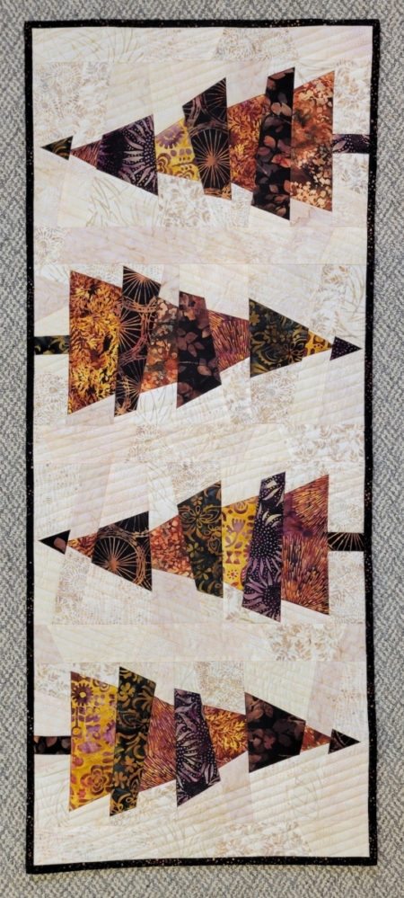 Wonky and contemporary trees in a variety of brown batiks adorn this table runner which is made with the Spider Web ruler. 16.5″ x 43.5″