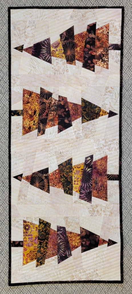Wonky and contemporary trees in a variety of brown batiks adorn this table runner which is made with the Spider Web ruler. 16.5″ x 43.5″