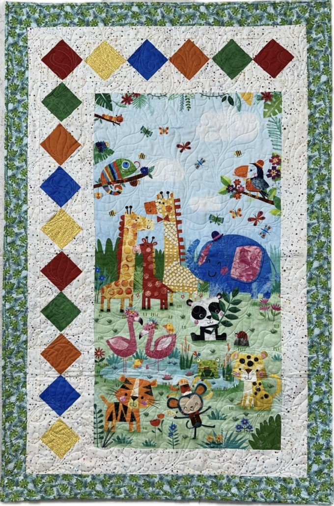 Fun jungle creatures make this a delightful quilt. 38.5″ x 57″