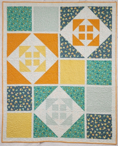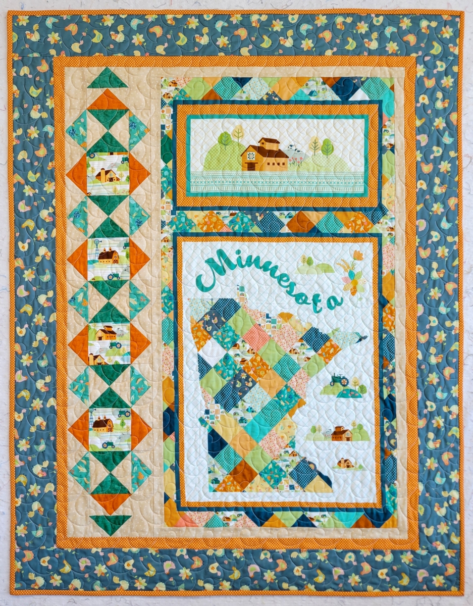 Radiating triangles ripple outwards across the quilt showcasing the exclusive All Minnesota Shop Hop fabric by Maywood. 55.5″ x 68.5″