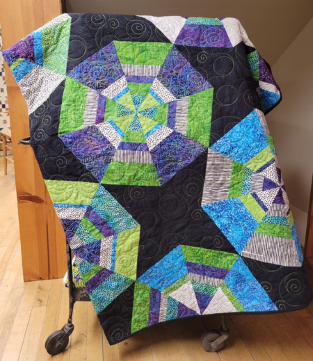 This one-of-a-kind quilt is designed to be both functional and beautiful. Made from high-quality quilt shop fabrics, meticulously pieced by an expert quilter and finished by professional longarm quilters, ensuring exceptional craftsmanship and durability. These quilts have been carefully maintained, used exclusively for display purposes only.