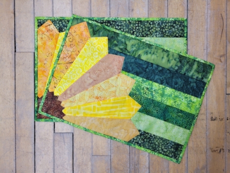 Fun and bright batiks made into fun placemats, or join together for a runner. Kit includes backing. Batting and Soft and Stable available separately. Uses a 15-degree ruler. 12″ x 18″ or 12″ x 40″.
