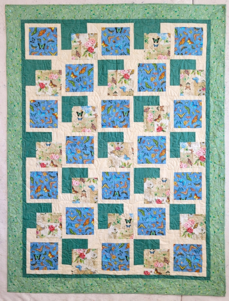 Butterflies flit amongst the summer flowers in this 5-yard quilt. 54″ x 72″